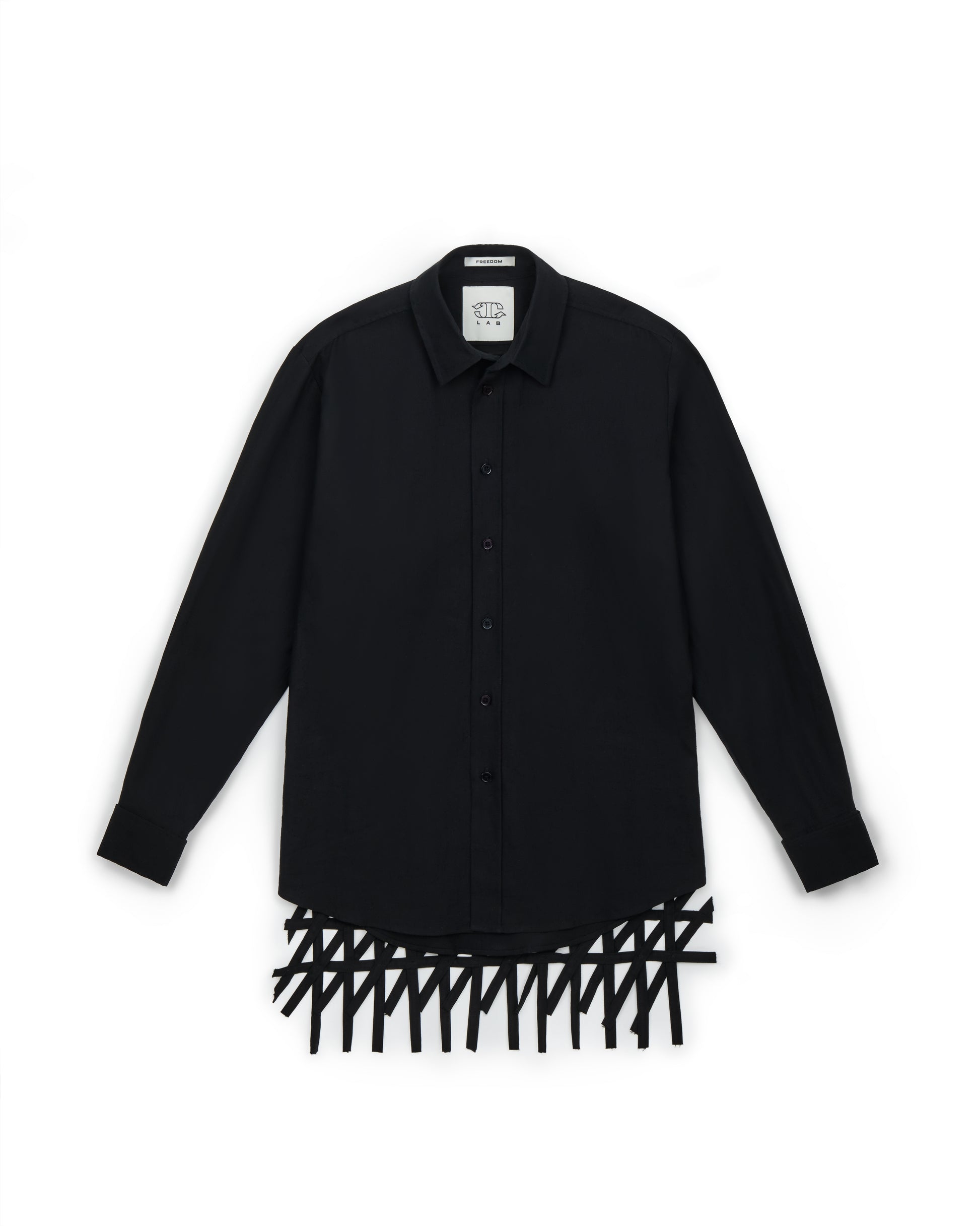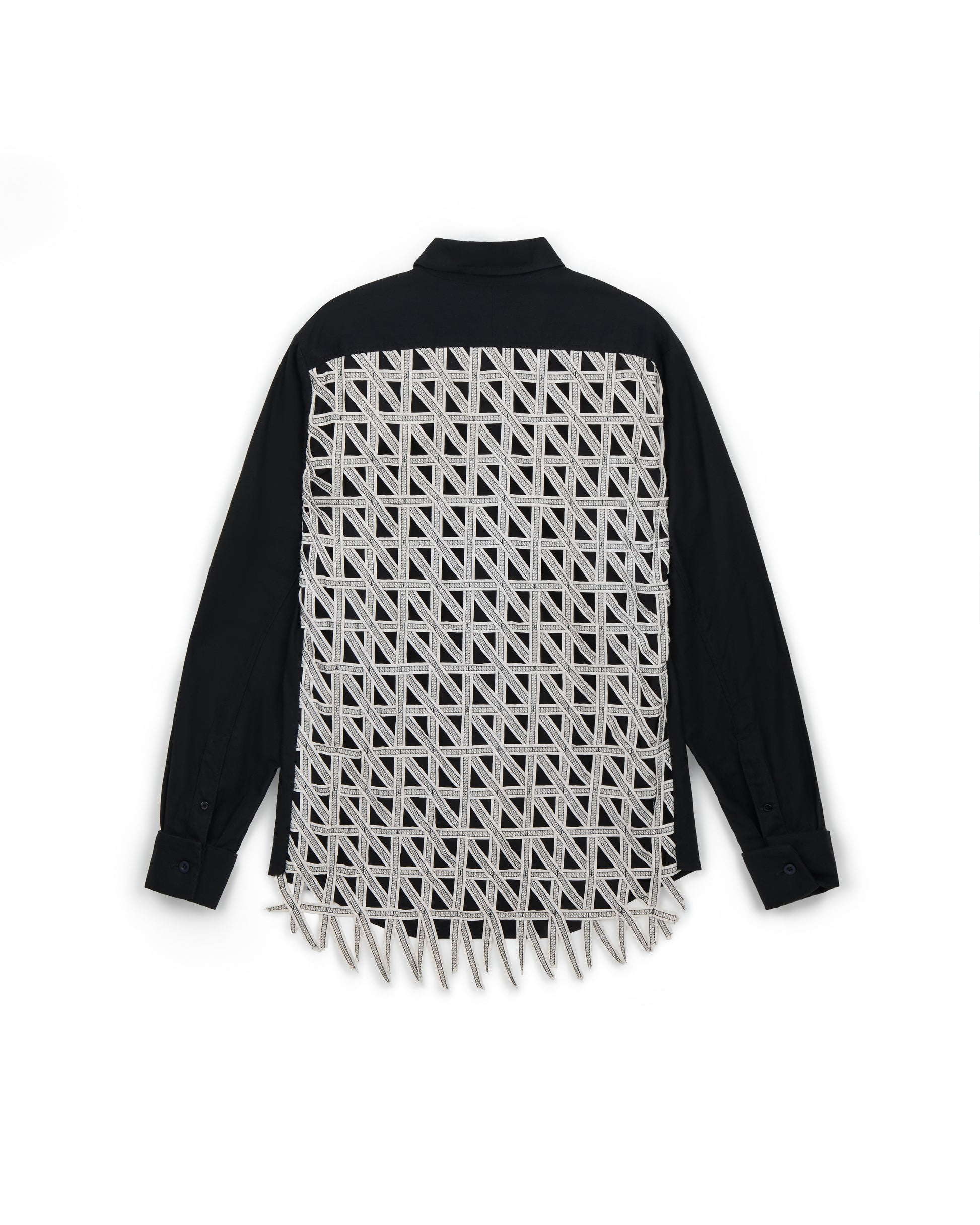 - Black linen shirt with white linen woven black stitching on back panel.